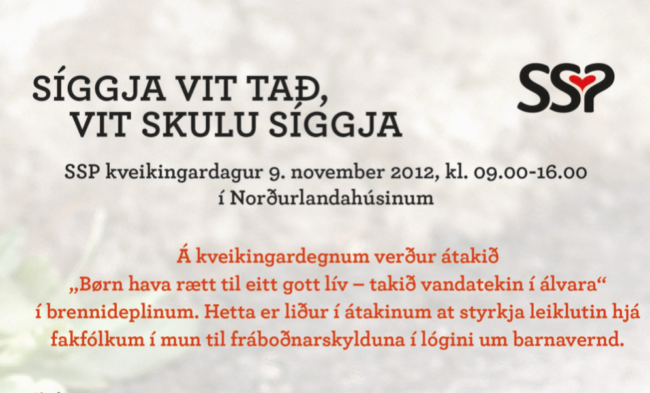 SSP kveikingardagur 2012 Skrivað Skúlablaðið. Á triðja sinni skipar SSP-ráðgevingin fyri Kveikingardegi, har viðurskifti verða umrødd, sum kunnu styrkja leiklutin hjá teimum, ið so ella so varða av børnum og uppvøkstri teirra. Ein av uppgávunum hjá ráðgevingini er at standa á odda fyri fakligari menning í sambandi við útgreiningar, átøk og nýhugsan um fyribyrging.…
