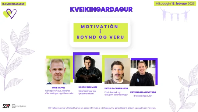 Starvast tú innan barna- og ungdómsøkið í Føroyum í breiðastu merking? So kom við til ráðstevnuna hjá SSP Kveikingadagur 2026 har vitan og íblástur innan fyribyrging er á breddanum. Kveikingardagurin er dagurin, har vit hittast tvørtur um geirar við tí máli, at vit í felag kunnu gera okkara til, at børn og ung trívast í Føroyum. Dagurin er ætlaður starvsfólkum á…