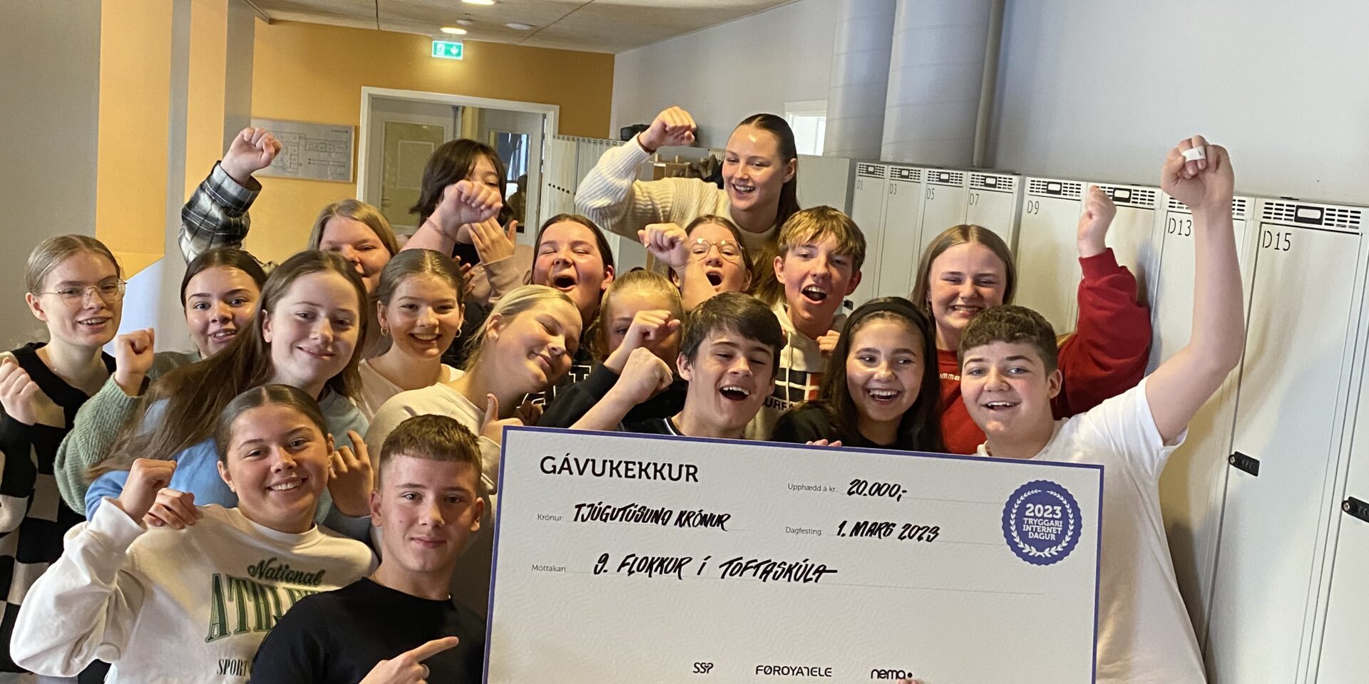 9. flokkurin í Tofta skúla fekk sostatt óvæntaða vitjan í dag av SSP, Nema og Føroya Tele, ið handaðu teimum 20.000 kr fyri teirra flotta uppskot.