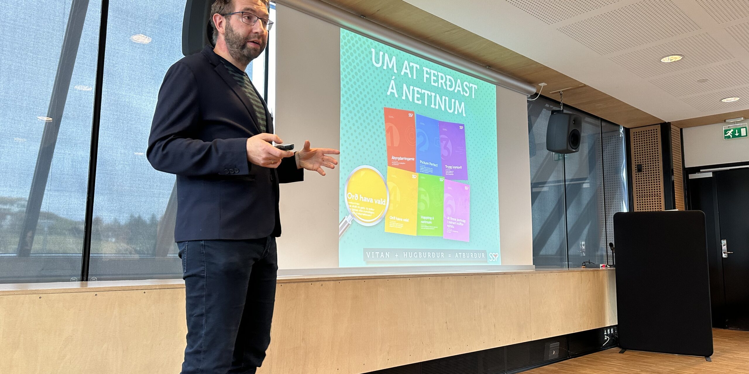 Djóni Nolsøe Joensen, landsstýrismaður bar røðu fram og síðani greiddi Eyðun Gaard, stjóri, frá hesum stóra tiltaki. Gleðiligt var, at SSP longu var nevnt á morgni, tí talgildisbúgving er ikki bert at nýta tøkni, men nógv breiðari virkisøkið, ið SSP eisini eigur sín leiklut í.