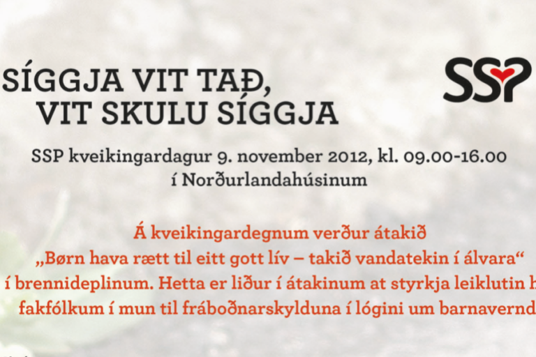 SSP kveikingardagur 2012 Skrivað Skúlablaðið. Á triðja sinni skipar SSP-ráðgevingin fyri Kveikingardegi, har viðurskifti verða umrødd, sum kunnu styrkja leiklutin hjá teimum, ið so ella so varða av børnum og uppvøkstri teirra. Ein av uppgávunum hjá ráðgevingini er at standa á odda fyri fakligari menning í sambandi við útgreiningar, átøk og nýhugsan um fyribyrging.…
