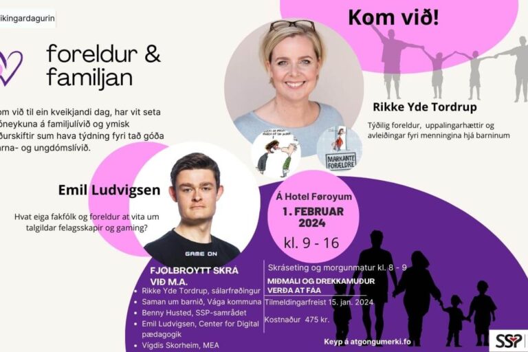 Vilt tú vera við til at skapa eina betri framtíð og trivnað fyri børn og ung? 🌟 Fríggjadagin 7. feb. verður spennandi ráðstevnan hjá SSP á Hotel Føroyum frá kl. 9.00 til 15.15! Dagurin snýr seg um fyribyrging og arbeiði við børnum og ungum, við nýggjari vitan💡, ítøkiligum hugskotum, og kveikjandi fyrilestrum🎤 – alt, sum…